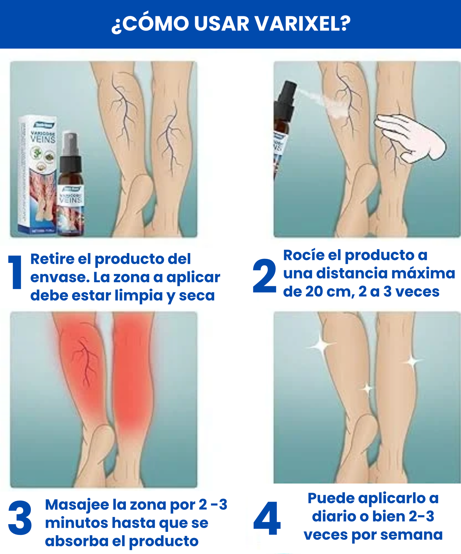 - 💧Varixel™ penetra de forma inmediata, combatiendo la fatiga, el dolor, y devolviendo a tus piernas una apariencia más joven y saludable.