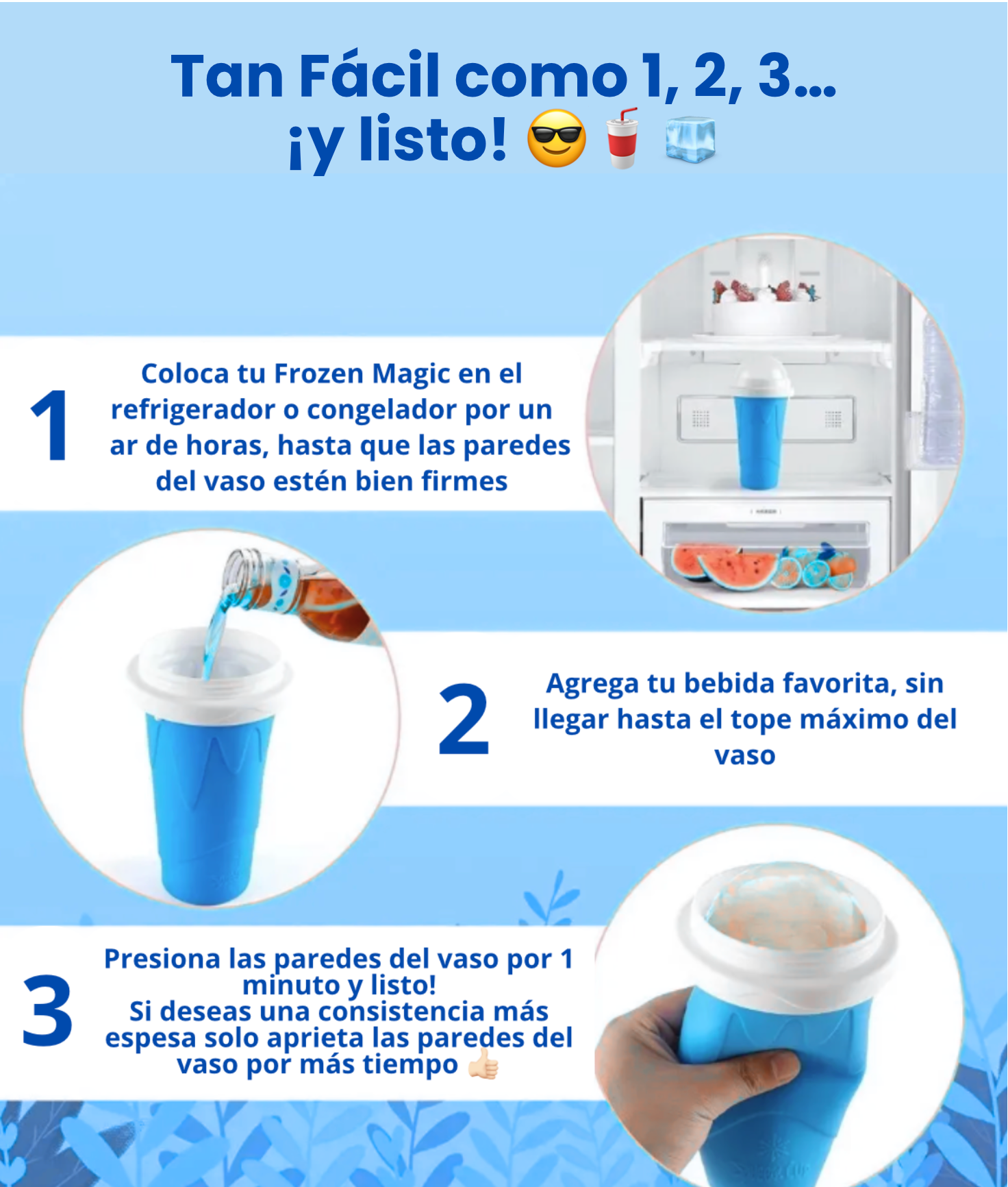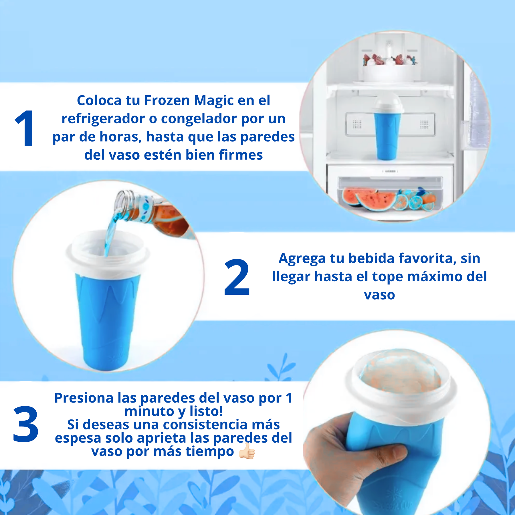 Con su tecnología de congelación inmediata, Frozen Magic transforma líquidos comunes en una bebida helada, espesa y deliciosa… todo sin máquinas, sin cables y sin esfuerzo. 🙌❄️